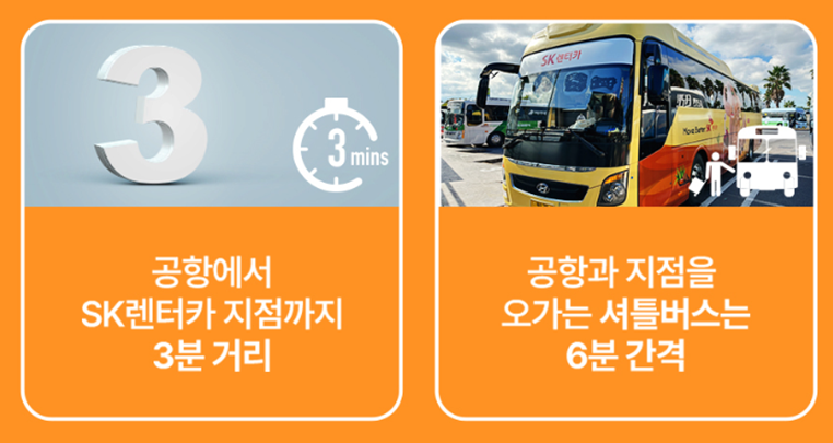 - 공항에서 sk렌터카 지점까지 3분 거리에 있고 셔틀버스가 6분 간격으로 운영되어 이용하기가 편리합니다.